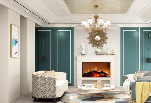 高貴的孔雀藍(lán)背景墻鑲嵌白色的金屬線條和白色的大理石相間,散發(fā)出精致而優(yōu)雅的格調(diào)。搭配淺色的窗簾,仿佛一打開窗,浪漫春風(fēng)攜帶點(diǎn)點(diǎn)花香便拂面而來。