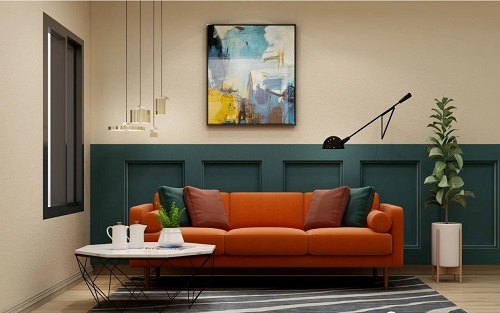 米色和墨綠色的結(jié)合,干凈而自然,而條形板的融入讓墻面顯的更加立體,透出一絲藝術(shù)氣息,墻面的裝飾畫以一抹跳躍的亮黃色給房間增色十足。
