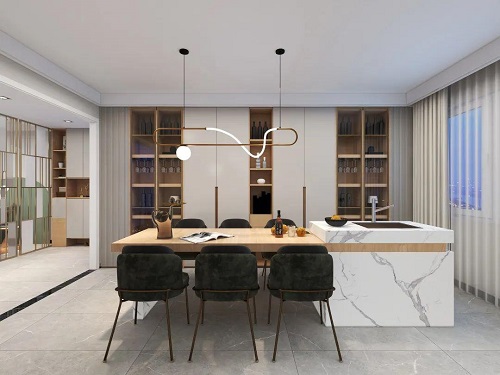 進入餐廳,映入眼簾的就是整面墻的酒柜,玻璃柜門與金屬線條的裝飾,滿滿的輕奢質感。
