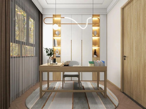 原木系的書柜書桌,搭配一些金屬五金的裝飾,也能帶有輕奢質感,在新穎的吊燈搭配下,原木書房也能有高級的時尚感。